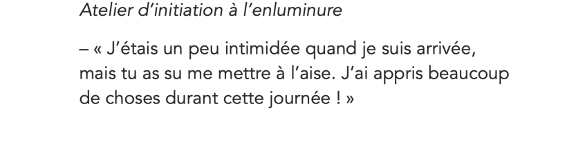 Apprendre l’enluminure avec moi, c’est prendre le temps d’entrer en relation avec une tradition historique et vivante, tout en découvrant que la beauté peut naître dans la lenteur et la simplicité.