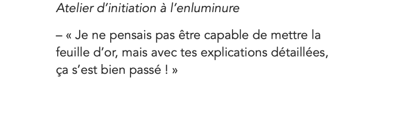 J’enseigne l’enluminure comme un temps suspendu, un moment où l’on apprend lentement, avec précision, mais sans pression.