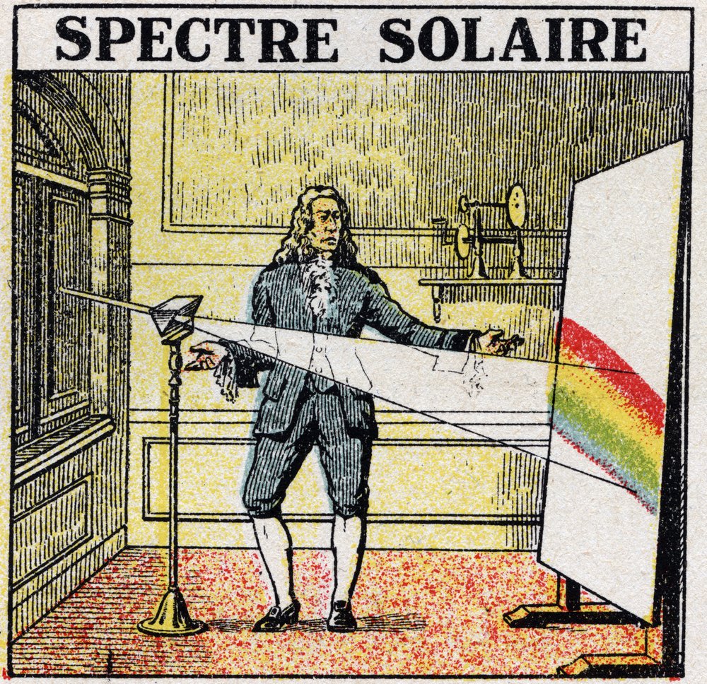 En faisant passer un rayon de soleil à travers un prisme de verre, Newton observa qu’il se décomposait en un spectre de sept couleurs distinctes, révélant que la lumière blanche était en réalité constituée d’une pluralité de rayons colorés. Pour rappel, ce spectre est constitué des couleurs suivantes : rouge, orange, jaune, vert, bleu, indigo et violet.